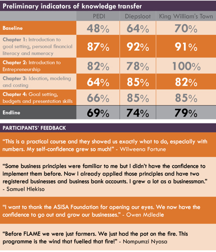 Your contribution enables the ASISA Foundation to offer the FLAME programme to more small business owners in townships and rural communities across the country, significantly increasing the programme’s reach and impact across the country.