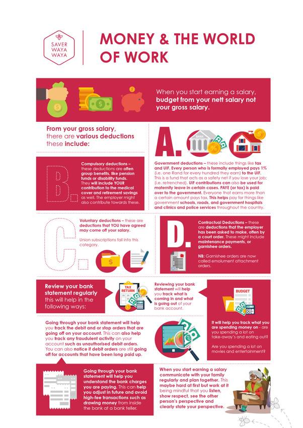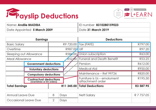 When you start working and earning a salary, you will get a payslip. You will notice some deductions and new terms which you need to be aware of. Knowing what to expect will help you budget better and be financially capable as well as ease some of the stress you may experience.