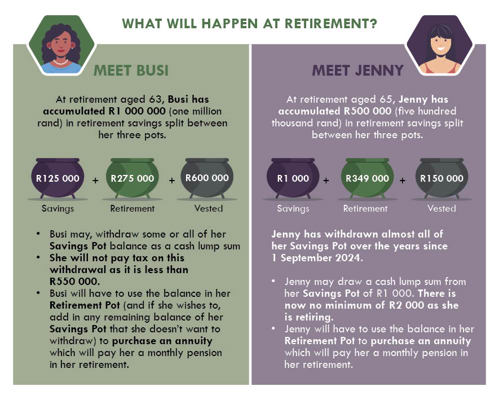 At retirement, you will be able to withdraw the balance of your Vested Pot as well as any balance in your Savings Pot as a cash lump sum. You will be taxed if the total amount of this withdrawal is greater than R550 000.