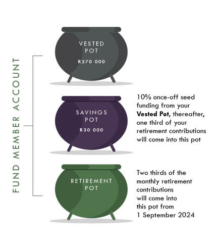 - Vested Pot: If you have a retirement fund on or before 1 September 2024 your current retirement fund will be moved into a Vested Pot. This pot will be 90% of your current retirement fund – with the 10% balance used to kick-start your Savings Pot as seed funding. This seed funding will be limited to R30 000 and this will be a once-off event. The remaining fund balance, called the Vested Pot, will still belong to you. The Vested Pot will continue to grow with investment returns, but no new contributions can be made into this pot. These funds will be available to you as a cash lump sum if you leave the fund.